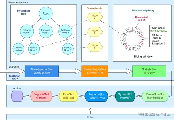 从设计模式上来看,典型的的责任链模式。外部请求进来后,要经过责任链上各个节点的处理,而Sentinel的限流、熔断就是通过责任链上的这些节点实现的。