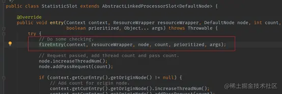 接下来就进入了责任链的执行。责任链和其中的Slot都实现了ProcessorSlot,责任链的entry方法会依次执行责任链各个slot,所以下面就进入了责任链中的各个Slot。为了突出重点,这次本文只研究与限流功能有关的Slot。