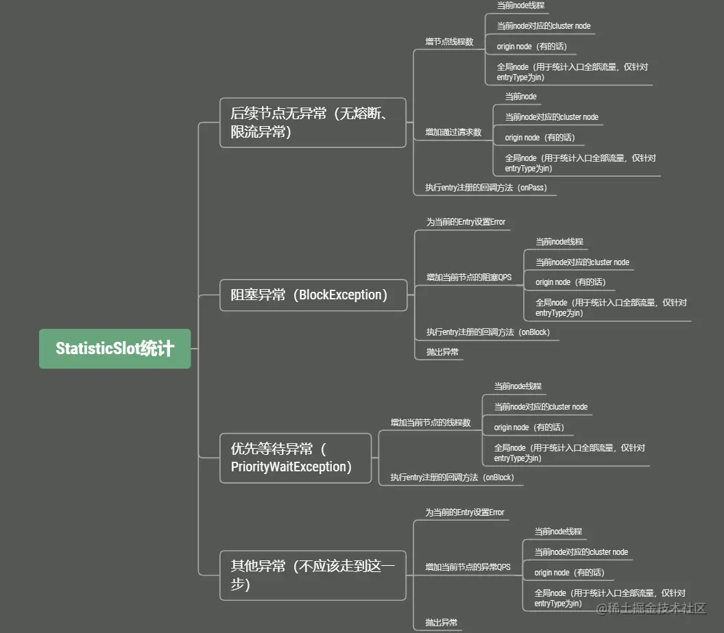 此节点主要负责资源调用的统计信息的计算和更新。与前面以及后面的slot不同,StatisticSlot的执行时先触发下一个slot的执行,等下面的slot执行完才会执行自己的逻辑。
