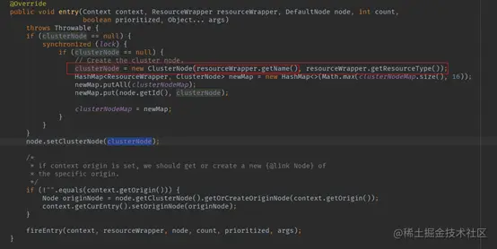 可以看到,ClusterNode的获取是以资源名为key。ClusterNode将会成为当前node的一个属性,主要目的是为了聚合同一个资源不同Context情况下的多个node。默认的限流条件判断就是依据ClusterNode中的统计信息来进行的。
