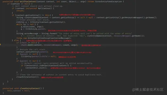 - 如果被退出entry的父entry为空,且context为默认context,自动退出默认context(清除ThreadLocal)。