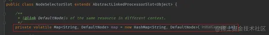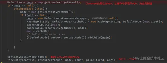此节点负责获取或者构建当前资源对应的Node,这个Node被用于后续资源调用的统计及限流和熔断条件的判断。同时,NodeSelectorSlot还会完成调用链路构建。来看源码: