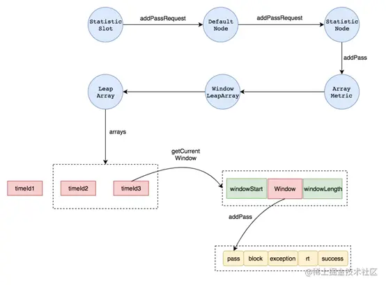其中,通过计数、阻塞计数、异常计数为执行StatisticSlot的entry方法时更新。成功计数及响应时间是执行StatisticSlot的exit方法时更新。其实就是分别在被拦截方法执行前和执行后进行相应计数的更新。当然,addPass就是在计数数组的第一个元素上进行累加。