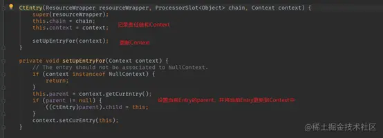 可以看到,新建CtEntry记录了当前资源的责任链和Context,同时更新Context,将Context的当前Entry设置为自己。可以看到,CtEntry是一个双向链表,构建了Sentinel资源的调用链路。