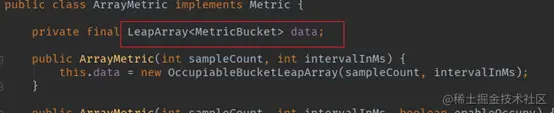 从源码可见,计数变量rollingCounterInSecond和rollingCounterInMinute都是Metric,两个变量的时间维度分别是秒和分钟。rollingCounterInSecond和rollingCounterInMinute用的是Metric的实现类ArrayMetric。