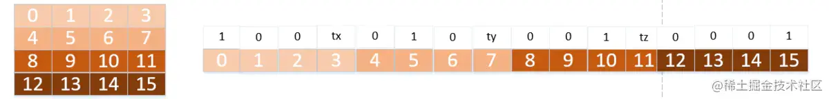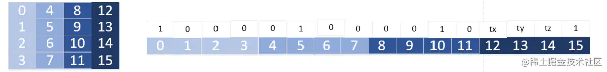 在 GLSL ES 里,矩阵是以列主序存储的,如上图,在 GLSL ES 里面,可做如下描述: