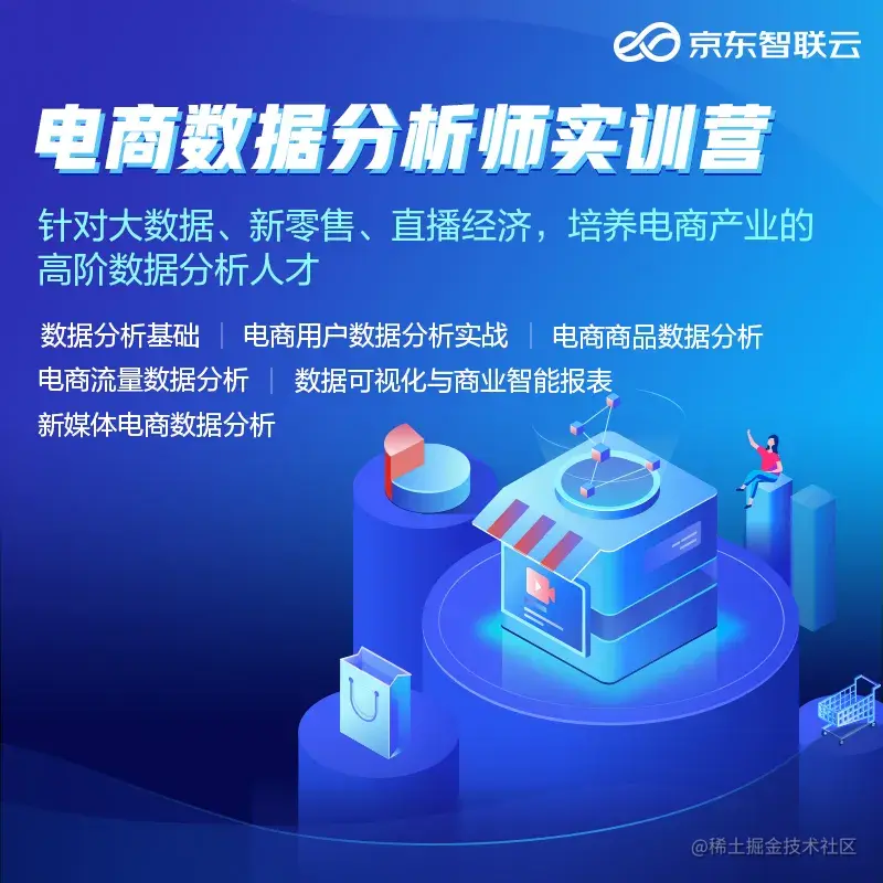 - 培训特点: 打破授课限制,线上直播课、线下面授自由选择,共建沉浸式训练营培养模式;依托京东真实项目数据、实战案例、技术大咖,开设电商数据分析师项目实战训练营,课程基于 CDA 数据分析 EDIT 数字化认证考试模型研发,无门槛培养全领域电商行业数据分析师。