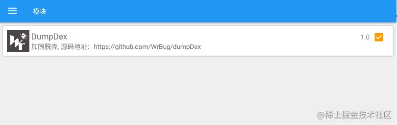 dumpdex安装完成是看不到软件图标的,打开Xposed之前安装成功会显示,框架已激活。然后点击左上角查看模块,勾选,然后重启模拟器,