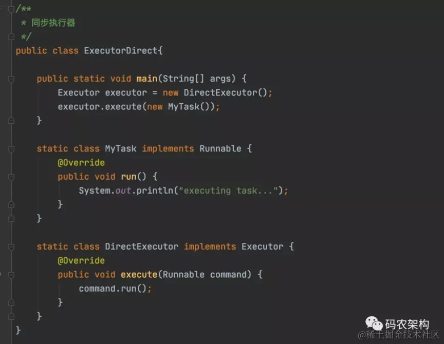 同步执行器是最简单的执行器,提交给它的任务将由调用线程直接执行,不需要其它线程的帮忙。如下演示代码中,DirectExecutor继承了Executor,它的execute方法直接调用了Runnable的run方法。我们在主线程中创建DirectExecutor对象后执行MyTask任务,实际上该任务将由调用线程(主线程)直接执行,最终输出executing task…。