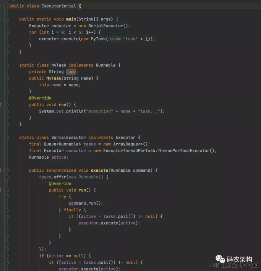 串行执行器是一种具有串行功能的执行器,所有任务被加入到一个先进先出队列中,然后内部的另外一个执行器会按照队列的顺序执行任务。前一任务执行完后负责启动后一任务的执行,这样就形成了串行。我们看下简单的实现,SerialExecutor类中包含了一个任务队列和执行器,这里使用ThreadPerTaskExecutor执行器。SerialExecutor的execute方法负责将任务加入到队列中,而且还负责开启第一个任务的执行。finally块主要负责启动下一个任务,从而形成环环相扣。