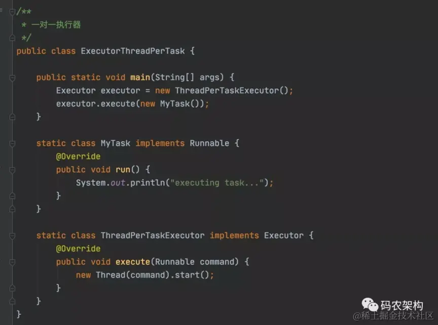 一对一执行器就是一个任务由一个线程负责,每个任务提交给执行器时都将创建一个新的线程来执行该任务。如下代码中,ThreadPerTaskExecutor的execute方法会新建一个线程执行任务。