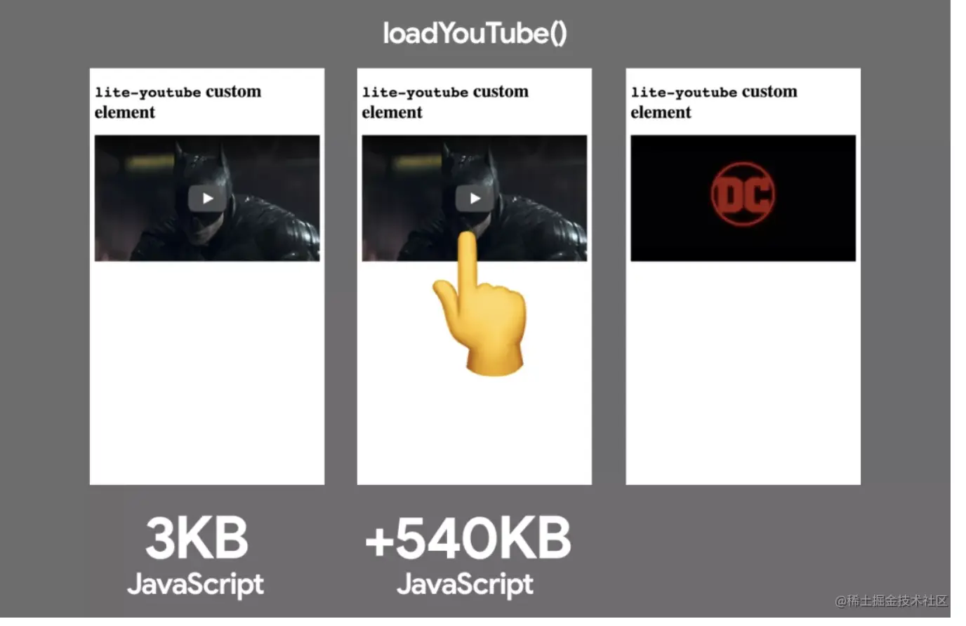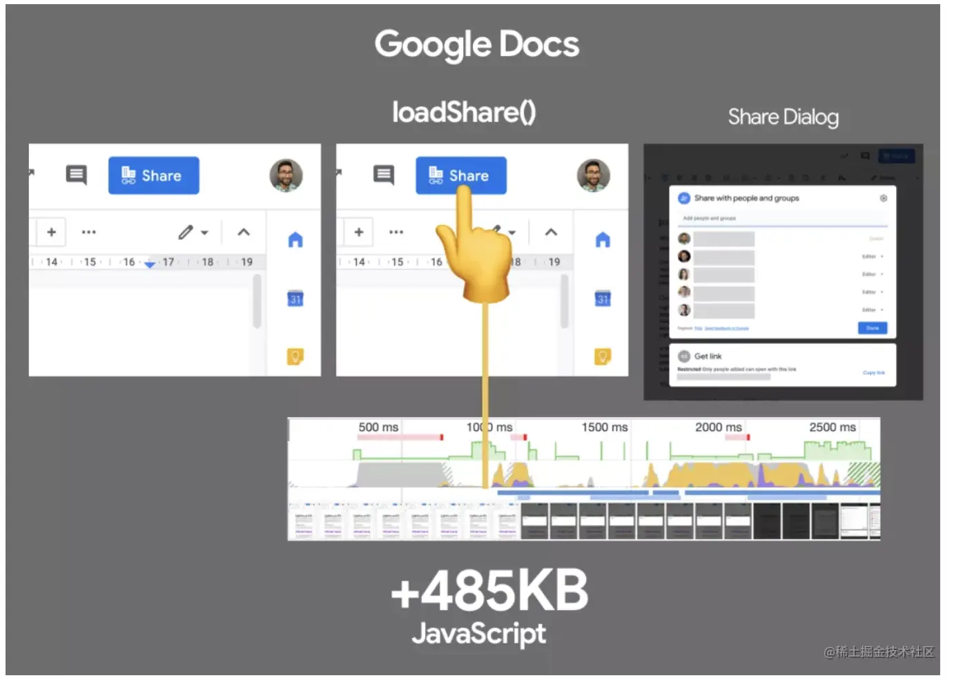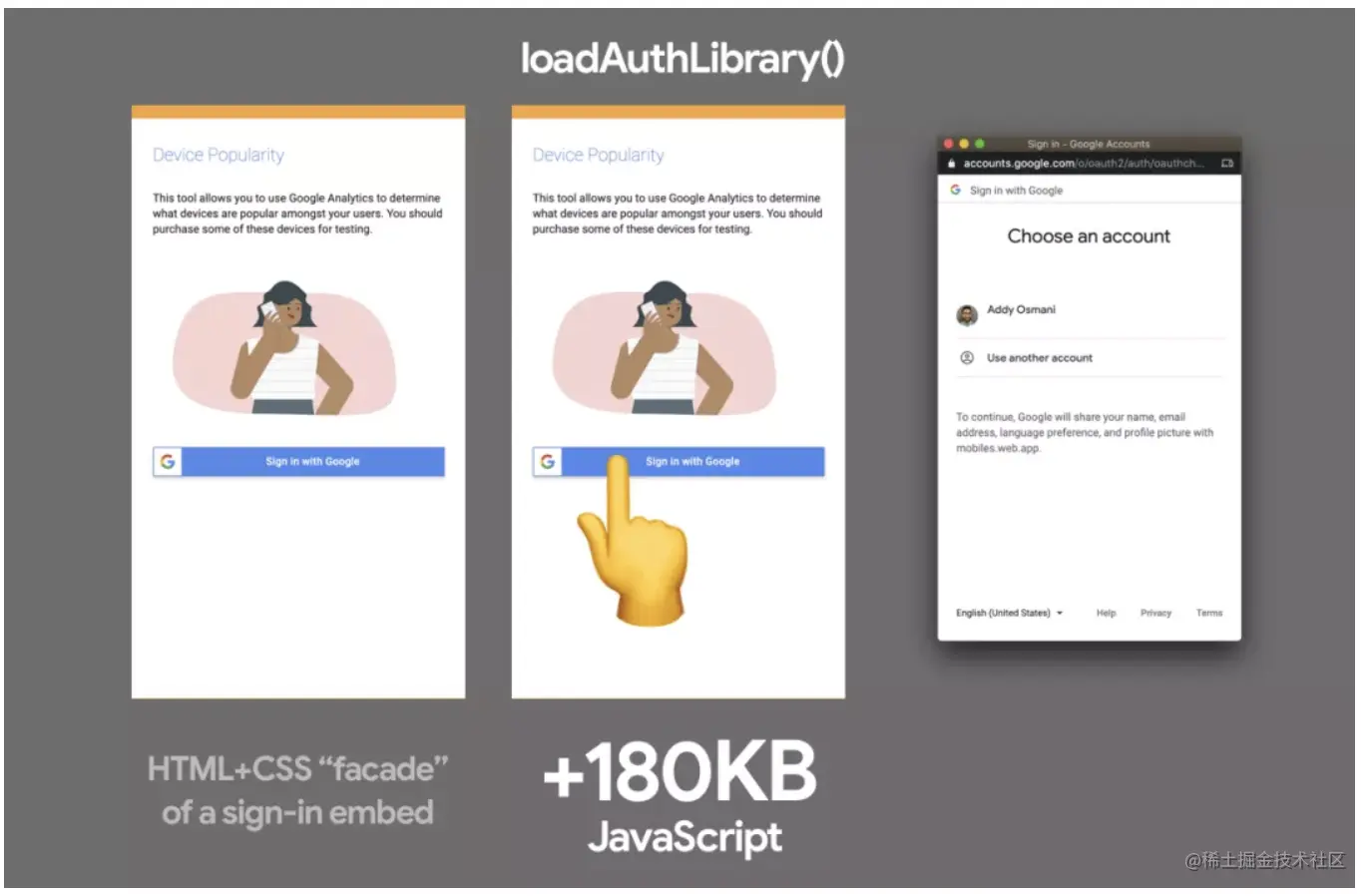 - 应用程序可能需要通过客户端的JavaScript SDK来支持与服务的认证。这些SDK有时会很大,JS执行成本很高,如果用户不打算登录,我宁可不急于在前期加载它们。相反在用户点击 "登录 "按钮时动态导入认证库,在初始加载时保持主线程更多的空闲状态。