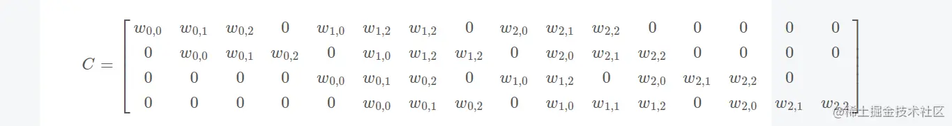 在上面这幅图中,底端为输入,上端为输出,卷积核为 3x3。如果我们用矩阵乘法去描述这个过程: 把 input 元素矩阵展开成一个列向量 X