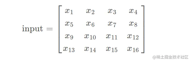 正向卷积的实现过程。假设输入的图片 input 尺寸为 4x4,元素矩阵为: