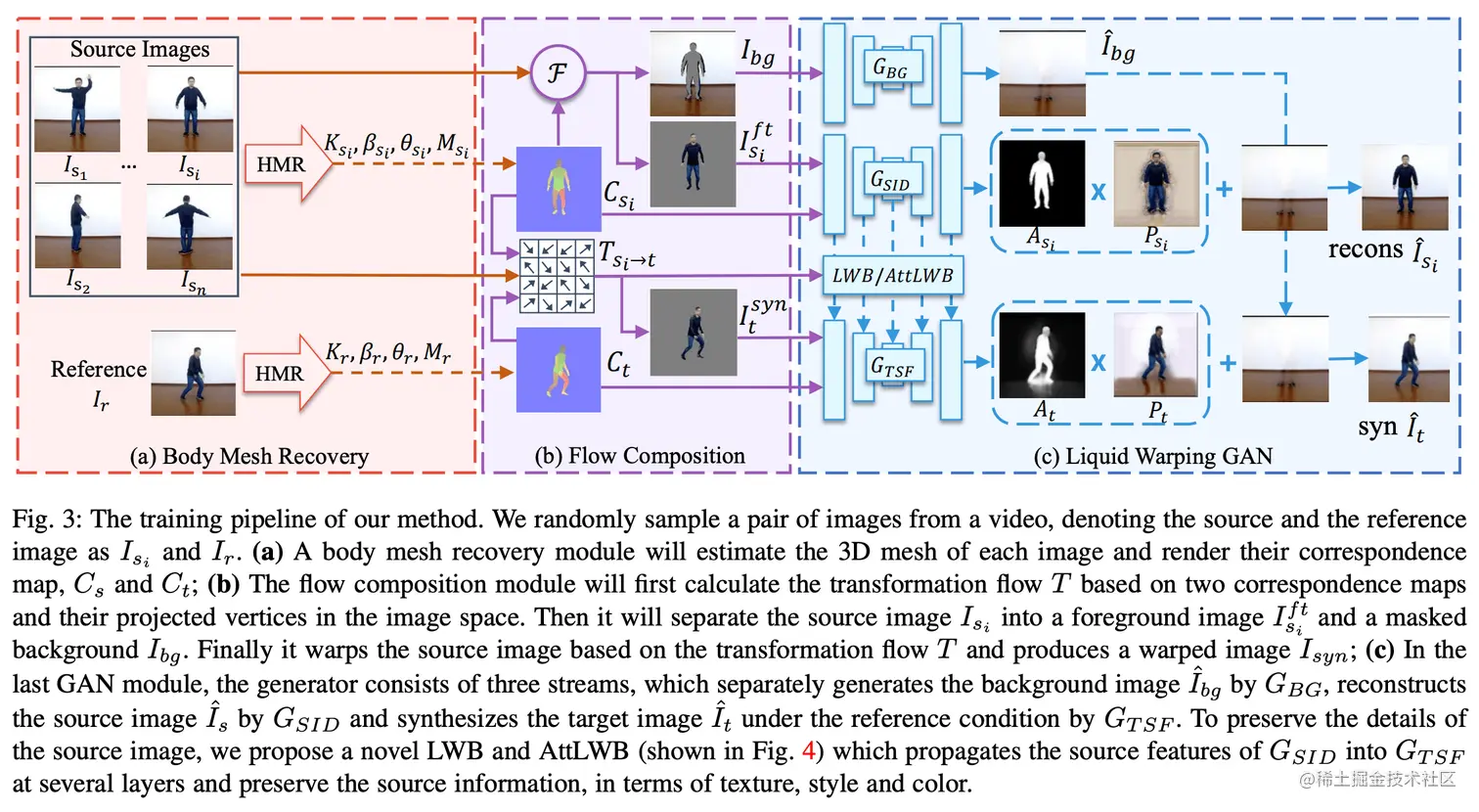 整个处理流程分为三个步骤:Body Mesh Recovery、Flow Composition、Liquid Warping GAN。