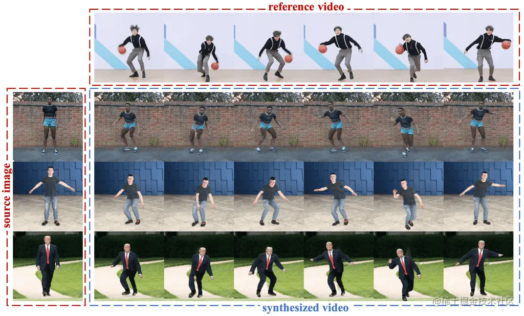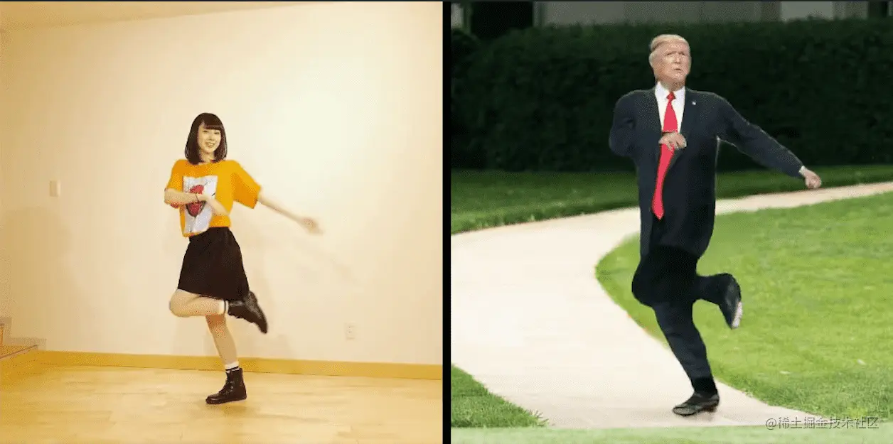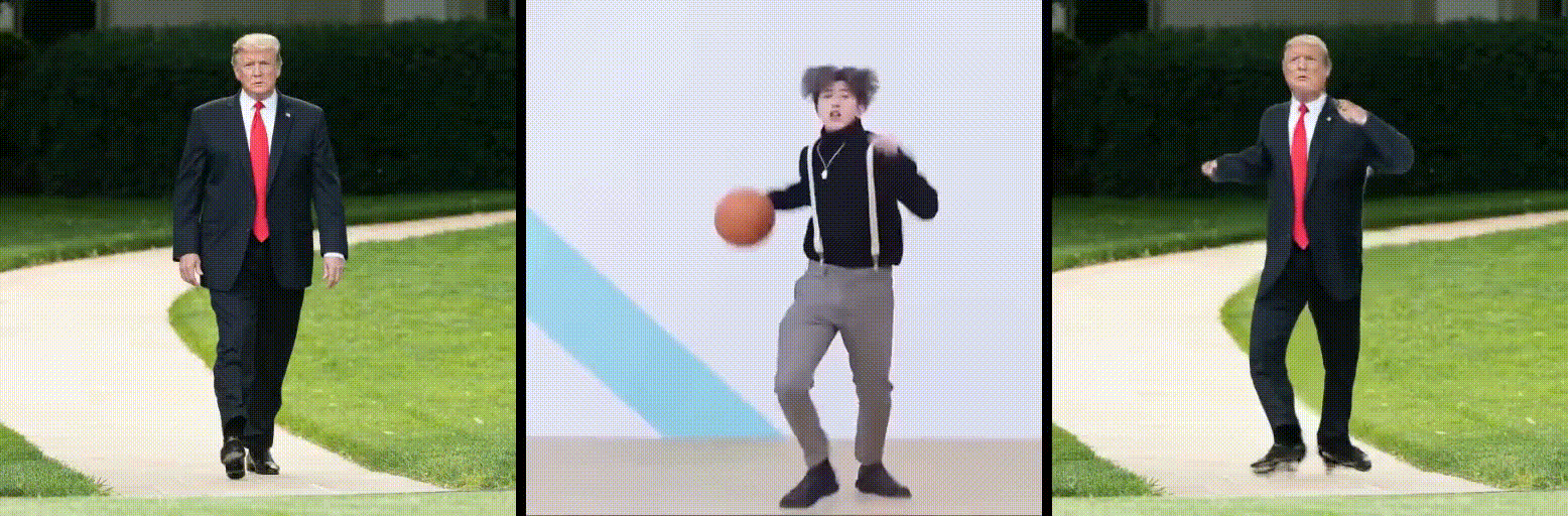 给定一张或者多张人物 A 的图像,和一段人物 B 的视频,就可以通过动作迁移算法自动合成一段人物 A 做任务 B 动作的视频。