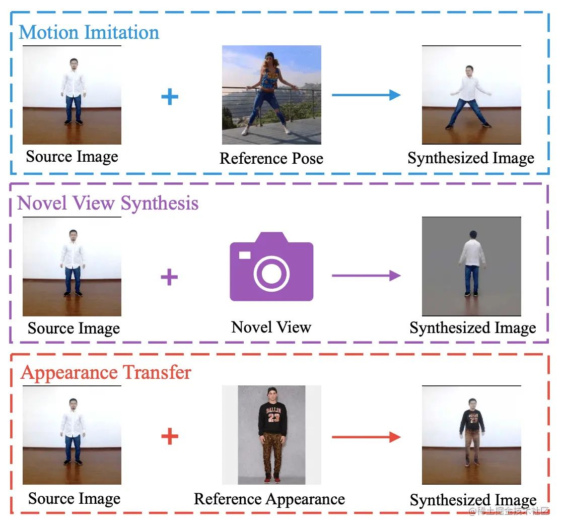 Impersonator++ 不仅可以做人体的动作迁移,人体图像合成的其它任务都可以 Cover,例如新视角合成、外观迁移。