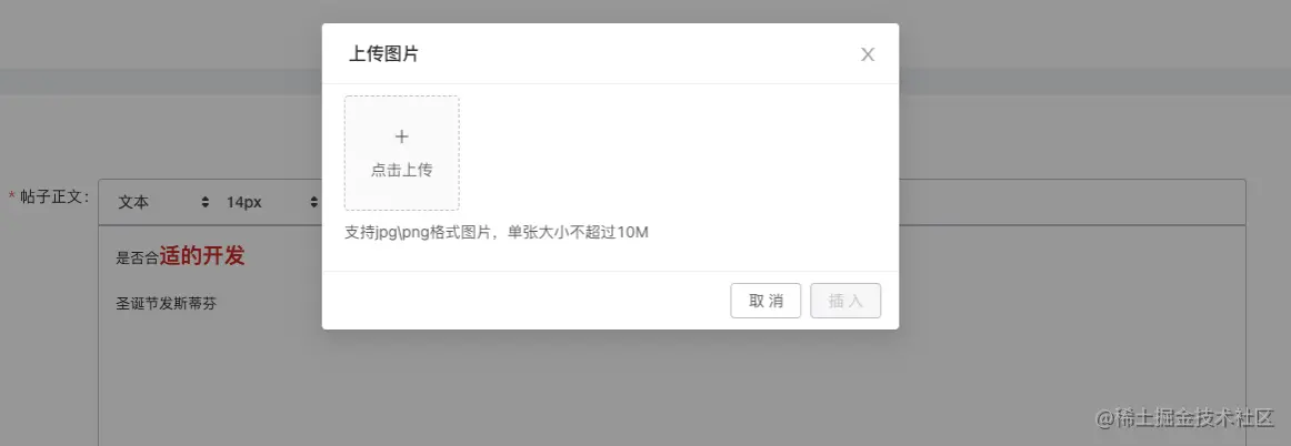 具体的弹窗逻辑就不过多展示,在拿到上传完的fileList数据,就在富文本插入图片。