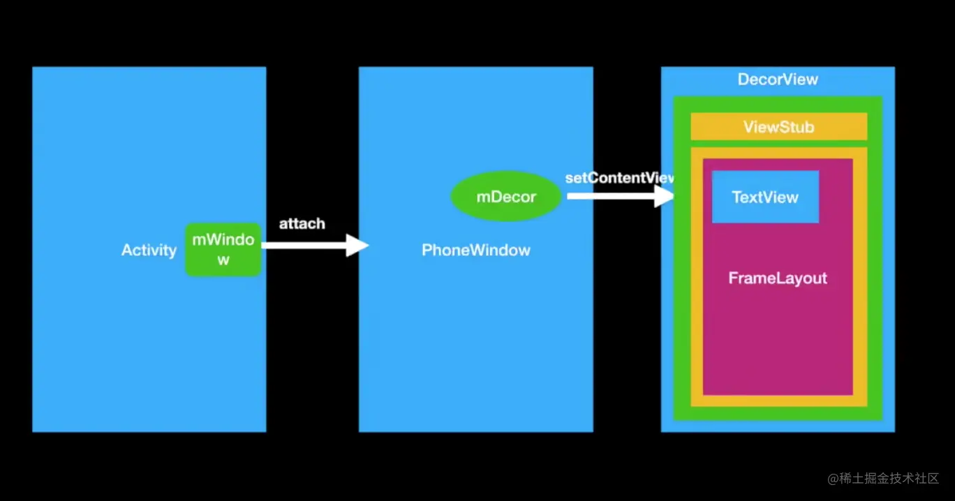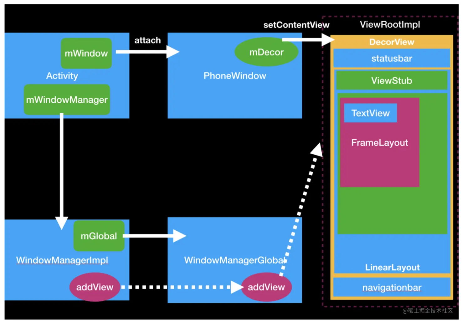 - 简单来讲,就是mWindow负责创建了窗体和布局容器DecorView,而mWindowManager负责将布局依附到布局容器DecorView中