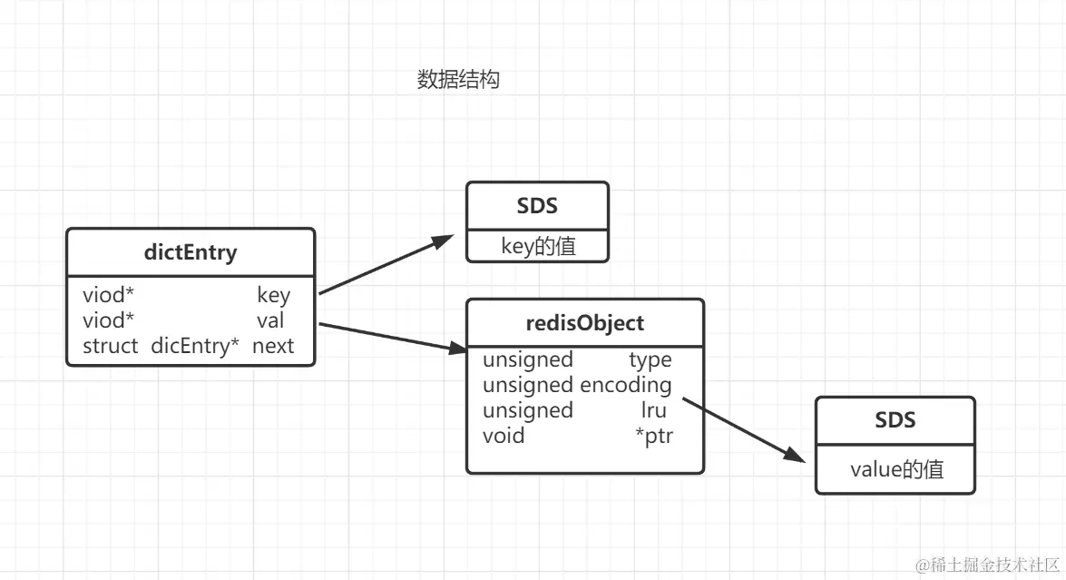 由上图可知,dictEntry里面存放kv,v又存放在redisObject里面,里面又存放编码、长度、内容等。