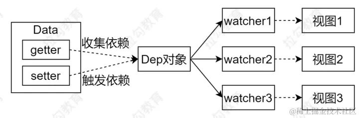 - 数据变化是触发依赖, dep通知所有的watcher实例更新视图