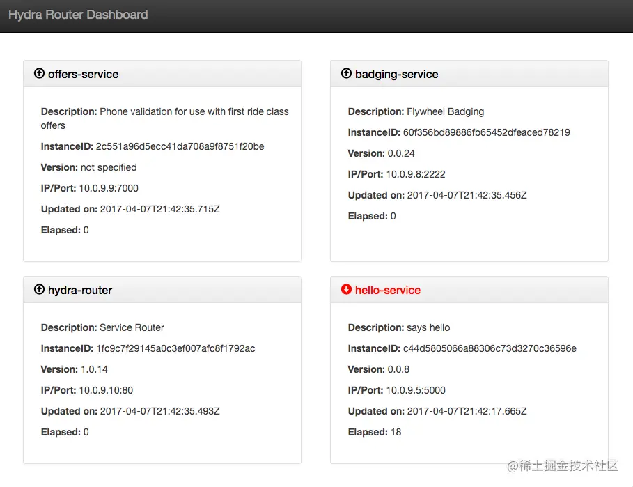 使用 Hydra 的微服务将其状态和运行状况存储在 Redis 中, 该信息可供对等服务和监视代理使用。