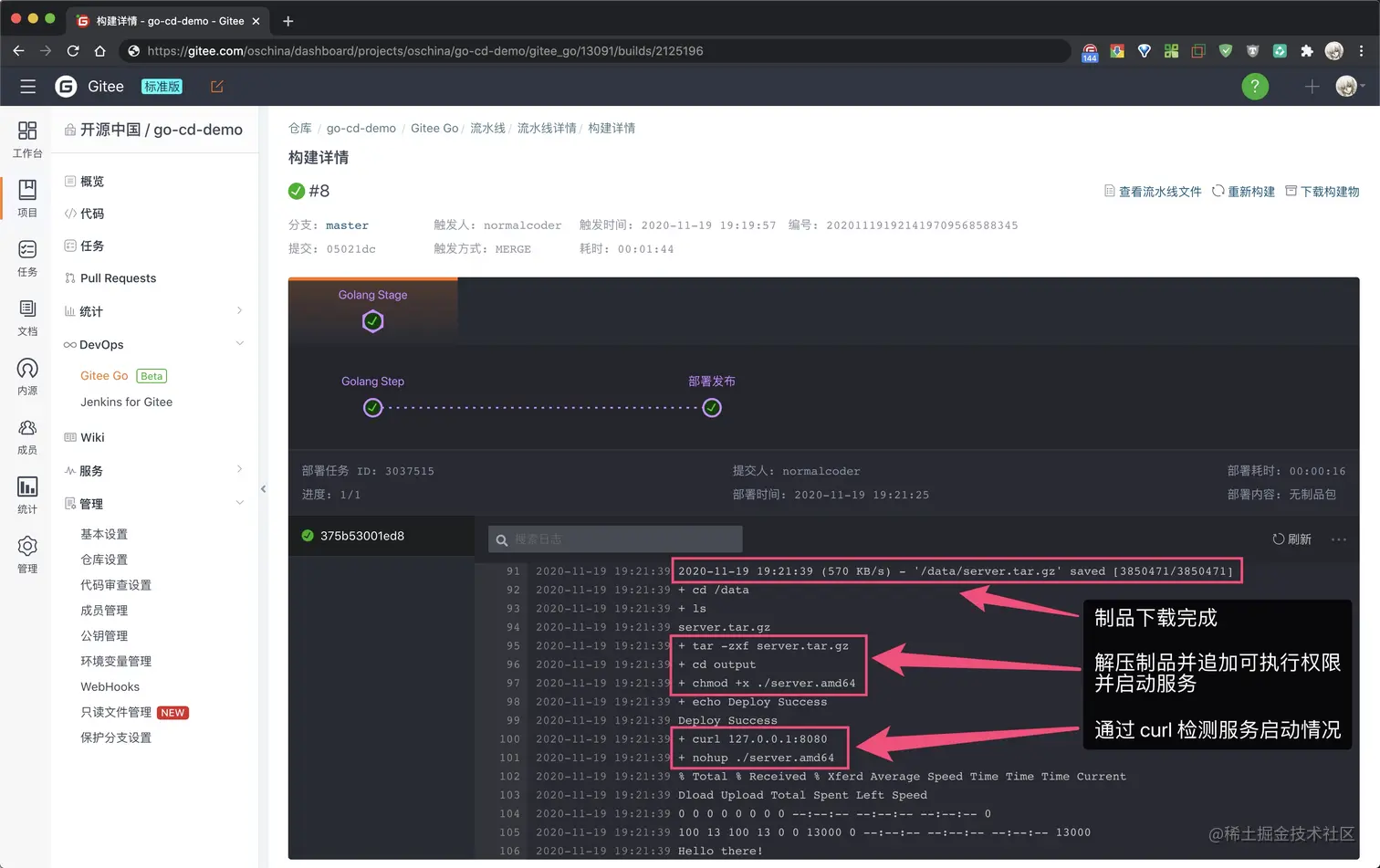 通过流水线构建服务端程序,并部署到目标机器部署,程序通过 8080 端口提供 web 服务,访问时输出 “Hello, Gitee Go” 的内容。在部署启动成功后通过 curl 检测服务启动情况。