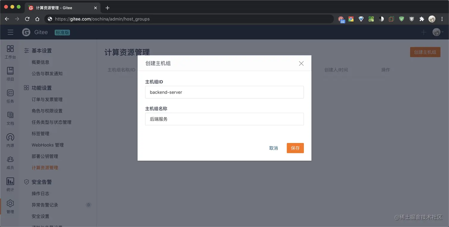 企业管理员通过访问 管理->功能设置->计算资源管理 进行设置管理。以下以创建名为 “后端服务”,唯一标识为 “backend-server” 的主机组为例。