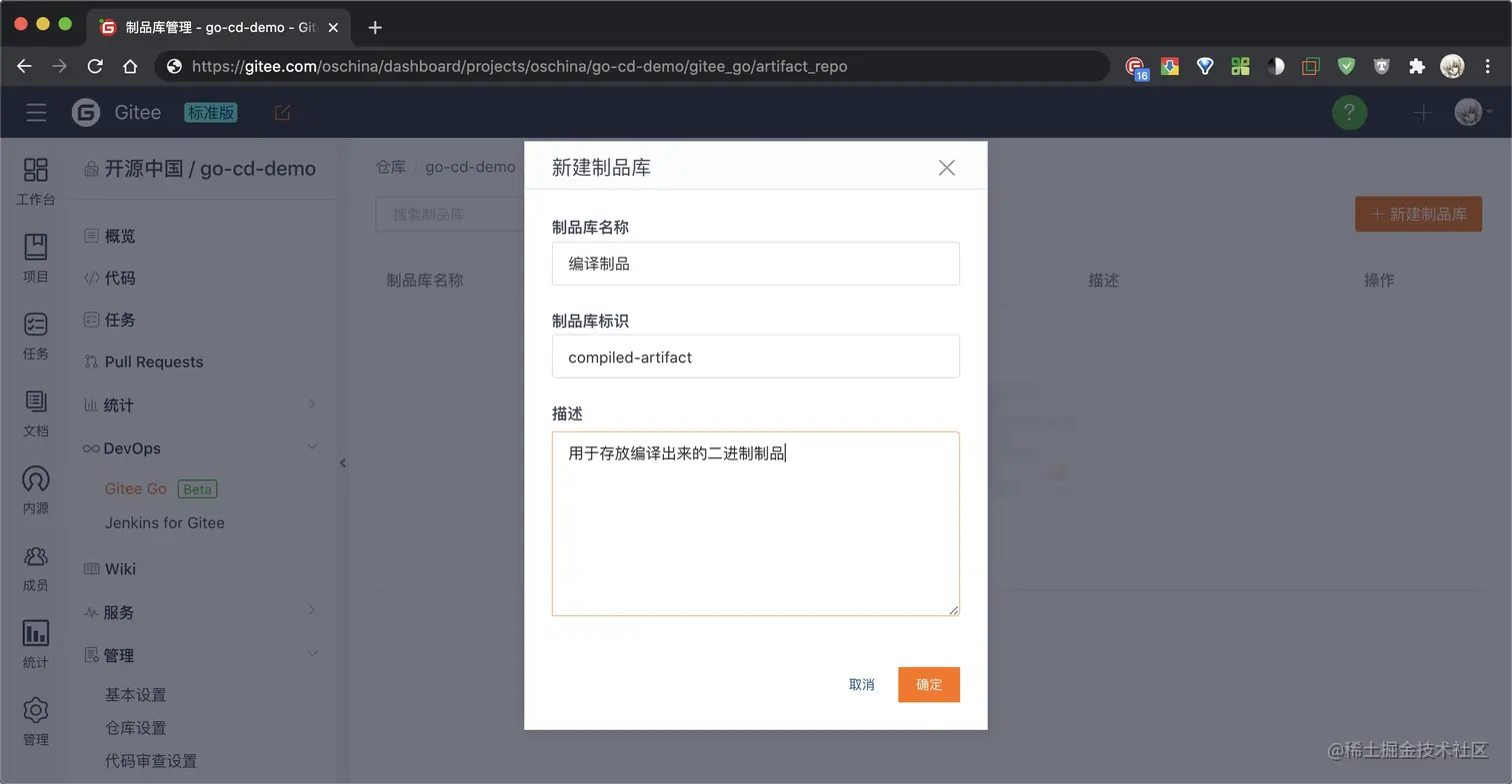 通过 Gitee Go 流水线页面找到「制品库管理」功能,创建一个制品库并设定制品库的唯一标识。此处以创建一个名为 “编译制品",唯一标识为 “compiled-artifact” 的制品库为例。如下图。