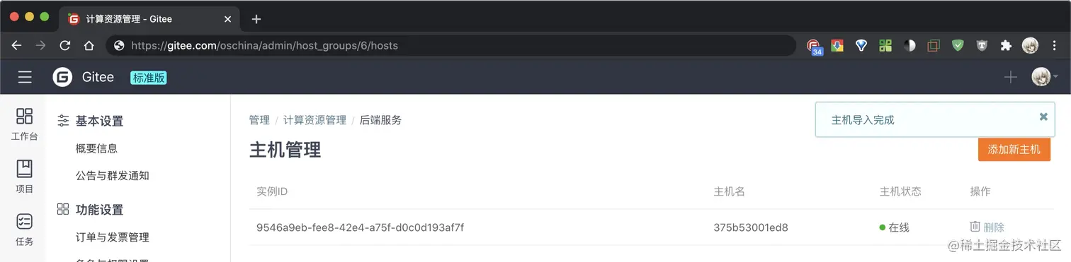 回到 Web 端,勾选已在线的主机,点击「添加主机」,完成主机添加。