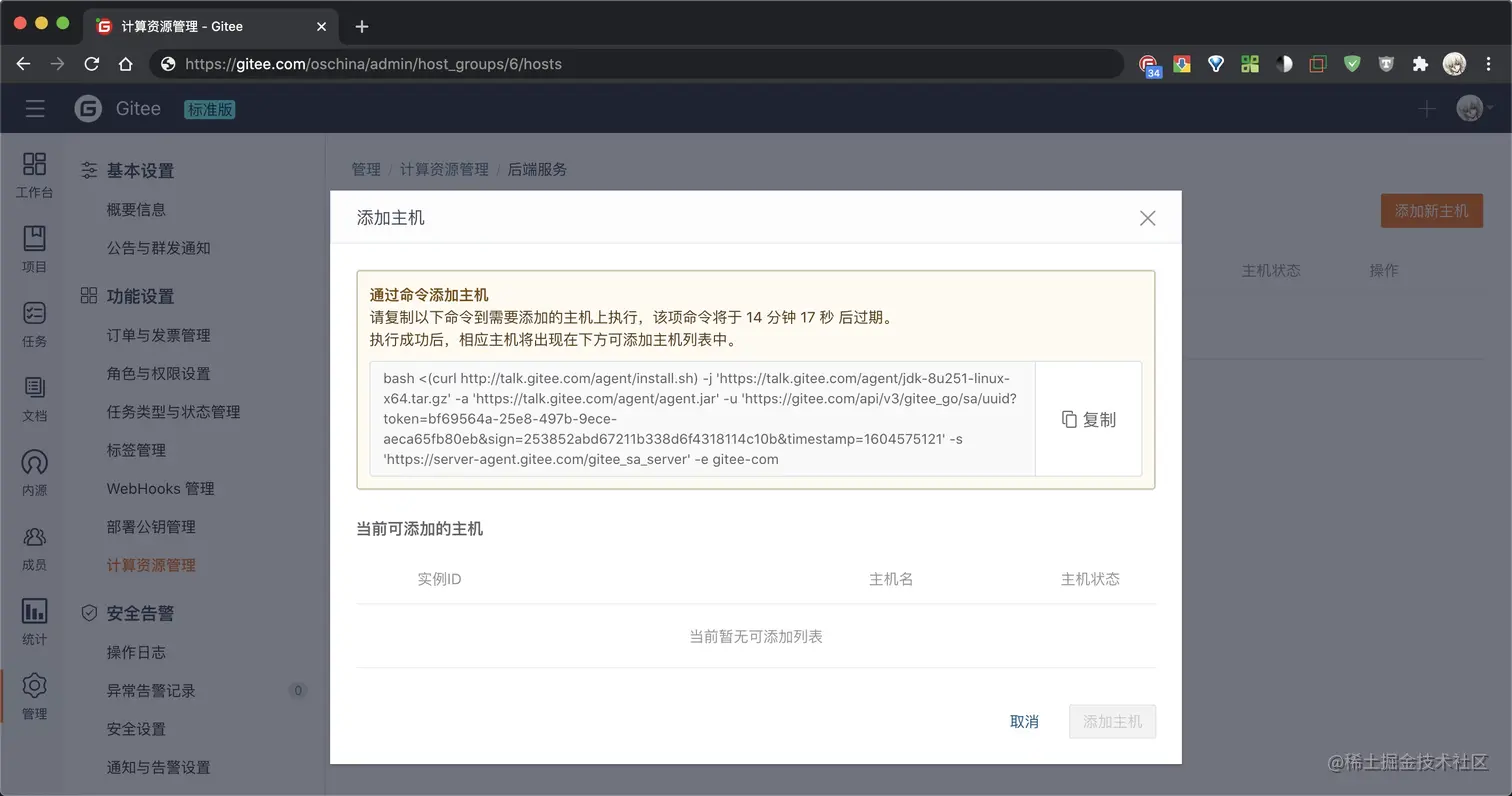在 Gitee Go 中,“计算资源管理” 功能主要用于管理用户的计算资源,如集群、云主机等。 目前对主机资源的管理主要通过在宿主机安装 Agent 程序实现对机器的管理。