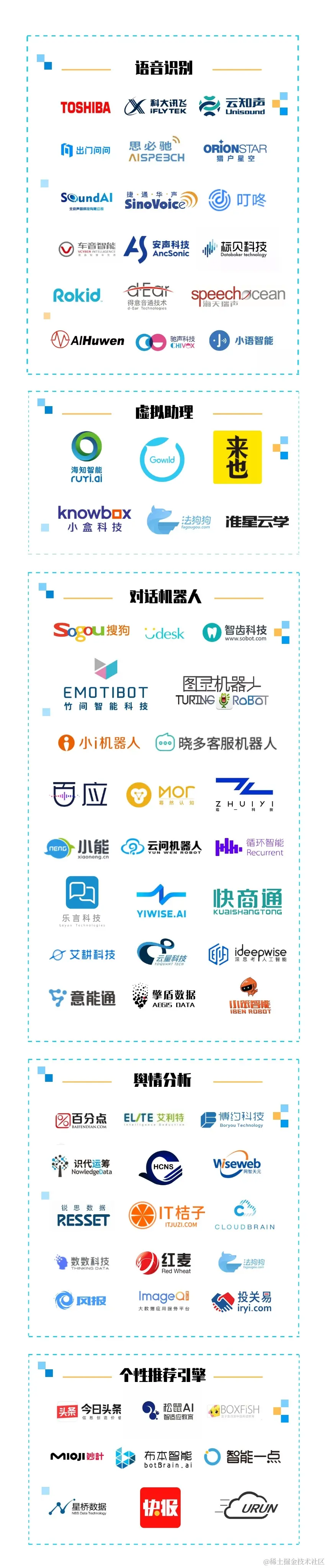 故此,程序员客栈-开发屋针对人工智能产业链进行全面梳理,通过产业链分层、产业细分归纳的方式,搜集罗列出425家次(部分企业领域跨度较大,将重复计算)的国内人工智能全领域企业图谱。
