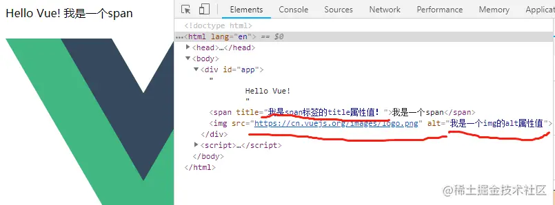 如上例所示,我们在data中声明了 spanTitle、imgAlt 和 imgSrc三个数据,通过v-bind:指令将数据渲染进DOM!