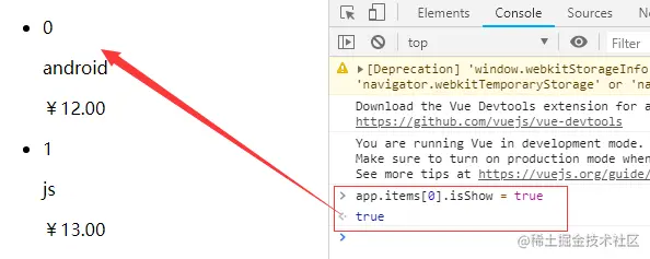 现有数据字段的变化:item[0].isShow = true;