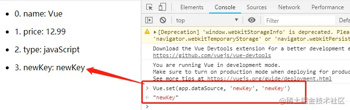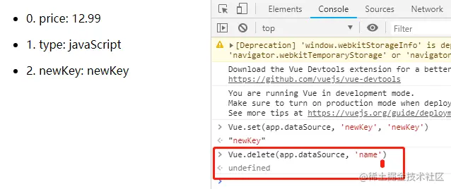 直接去添加或删除对象的属性:app.dataSource.newKey = 'newKey'