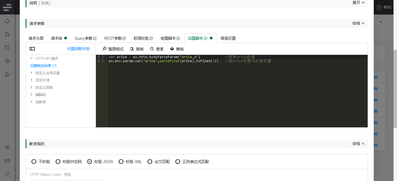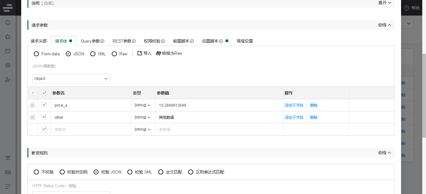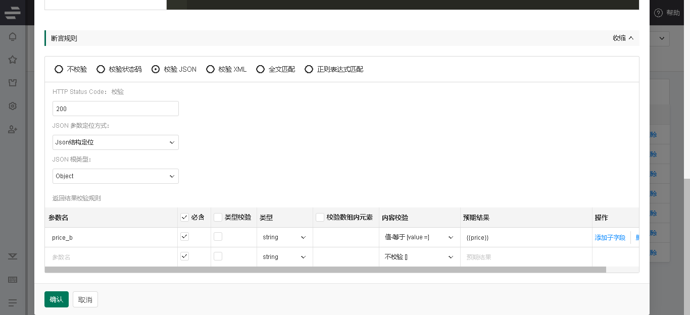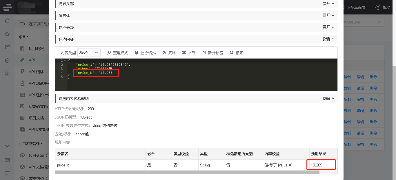 3、响应内容会返回一个price_b,是请求参数price_a保留三位小数后的数值。所以在断言规则校验JSON,参数值为price_b,预期结果等于{{price}},这里的{{price}}是获取第2步中环境变量price的值。