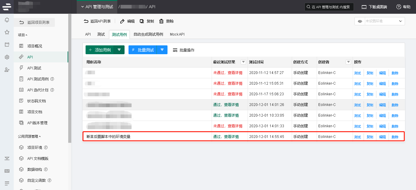 最近在使用eolinker进行API测试,在对返回结果进行断言时发现了个非常细节的设计,即断言可以获取后置脚本设置的变量的参数。下面讲一下我的测试过程。