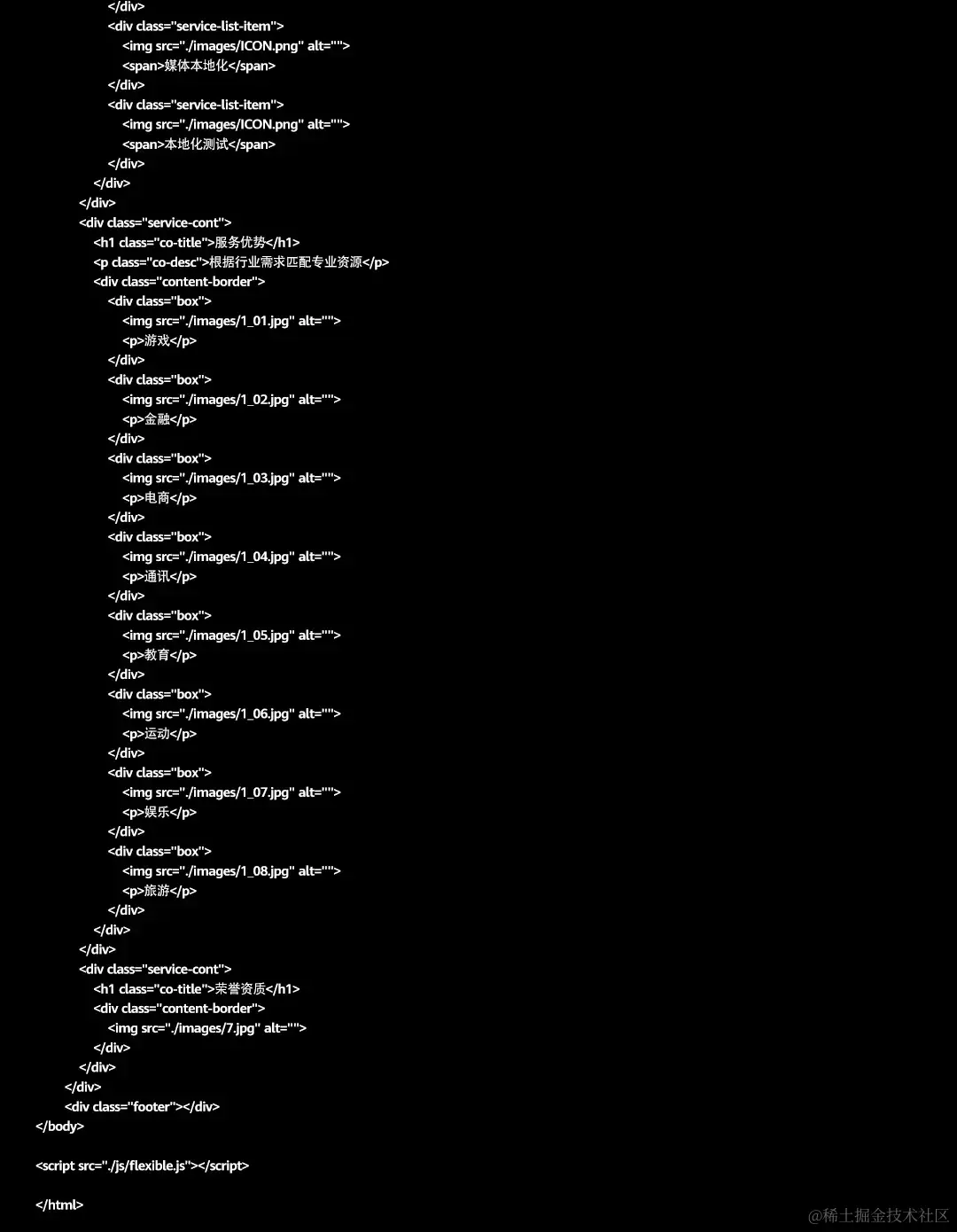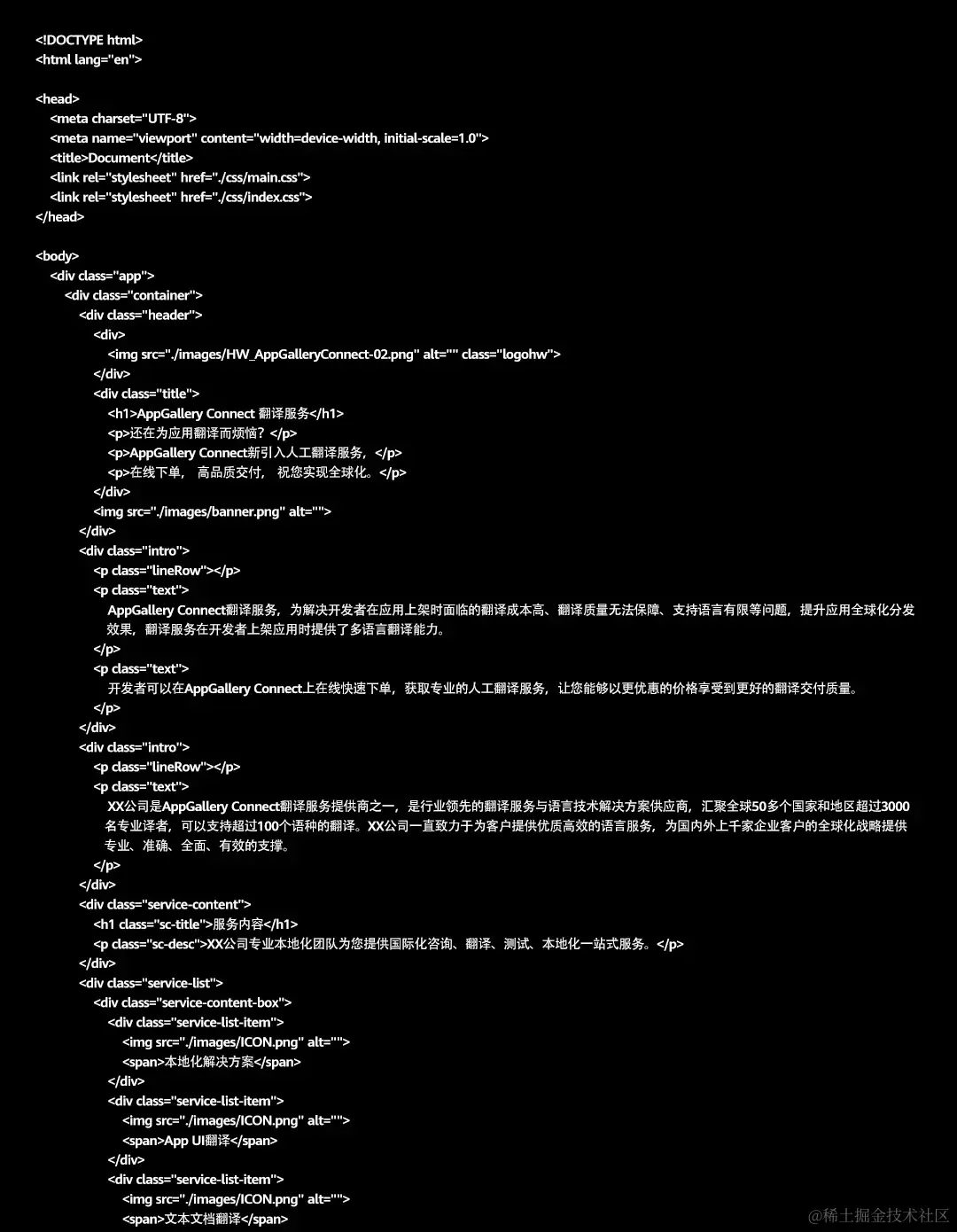 我们即将制作的网站,将用于托管AppGallery Connect翻译服务的宣传页,宣传页的内容包含翻译服务的介绍以及相关供应商的宣传资料,宣传页包含文字和图片两部分,内容的代码示例如下: