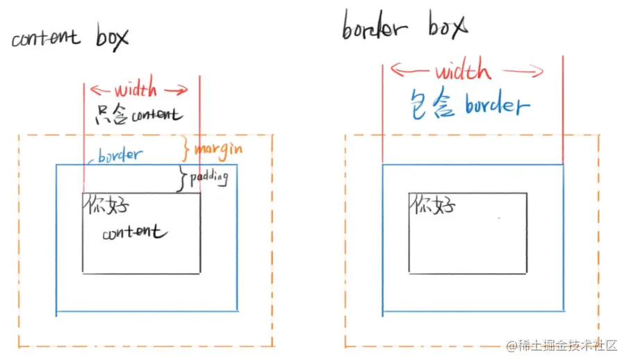 width只包含content,就是==content box==, box-sizing: content-box, width包含border,就是==boder box==box-sizing: content-box