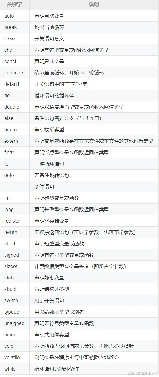 下表列出了 C 中的保留字。这些保留字不能作为常量名、变量名或其他标识符名称。