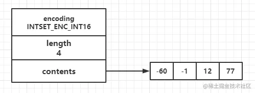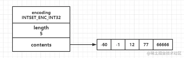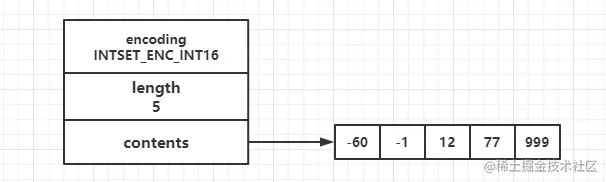 属性 contents 是一个数组,整数集合的每个元素都存储在了 content 数组里对应的下标位置里,他们按数值从小到大排序存储,且不含重复的整数值。