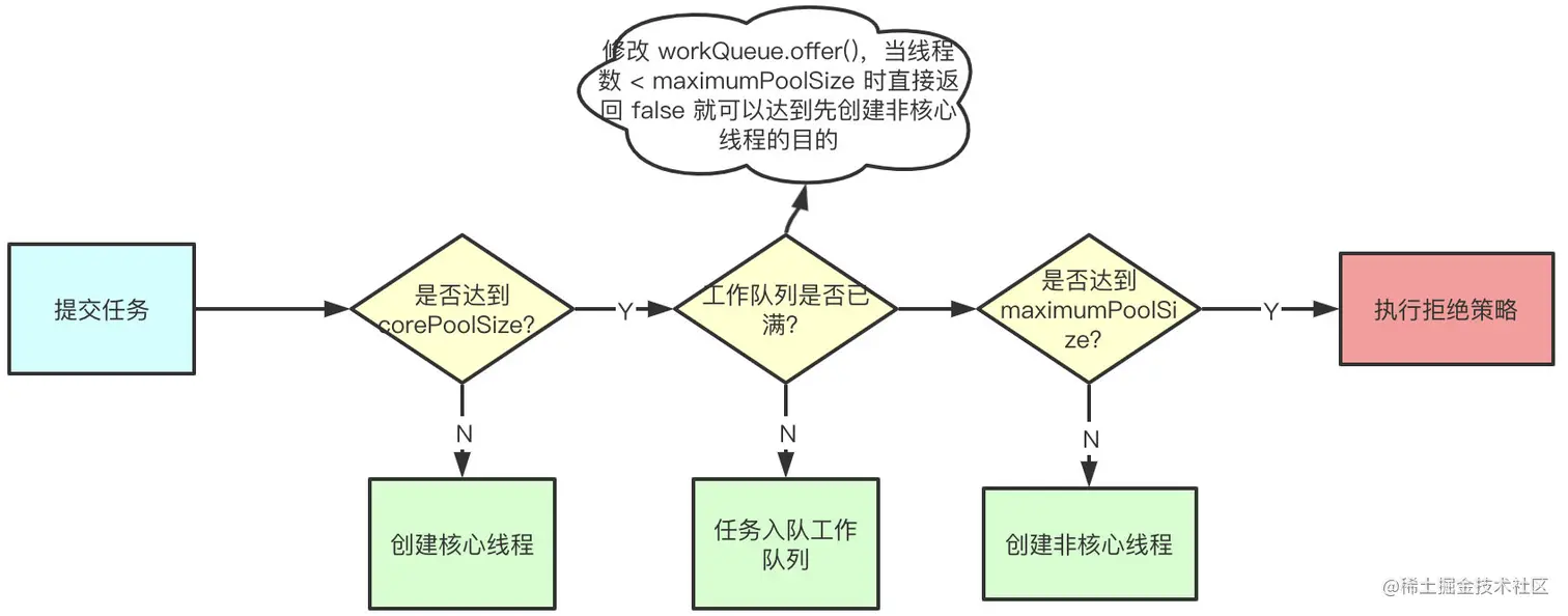通过自定义阻塞队列修改 offer() 方法逻辑,当线程数 < maximumPoolSize 时直接返回 false,execute 方法就会先创建非核心线程数,达到按照 core -> max -> queue 的执行顺序。