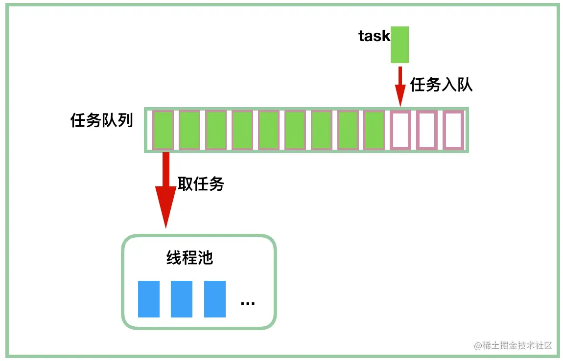 - 当前线程数达到核心线程数时,任务进入工作队列 workQueue,排队等待执行