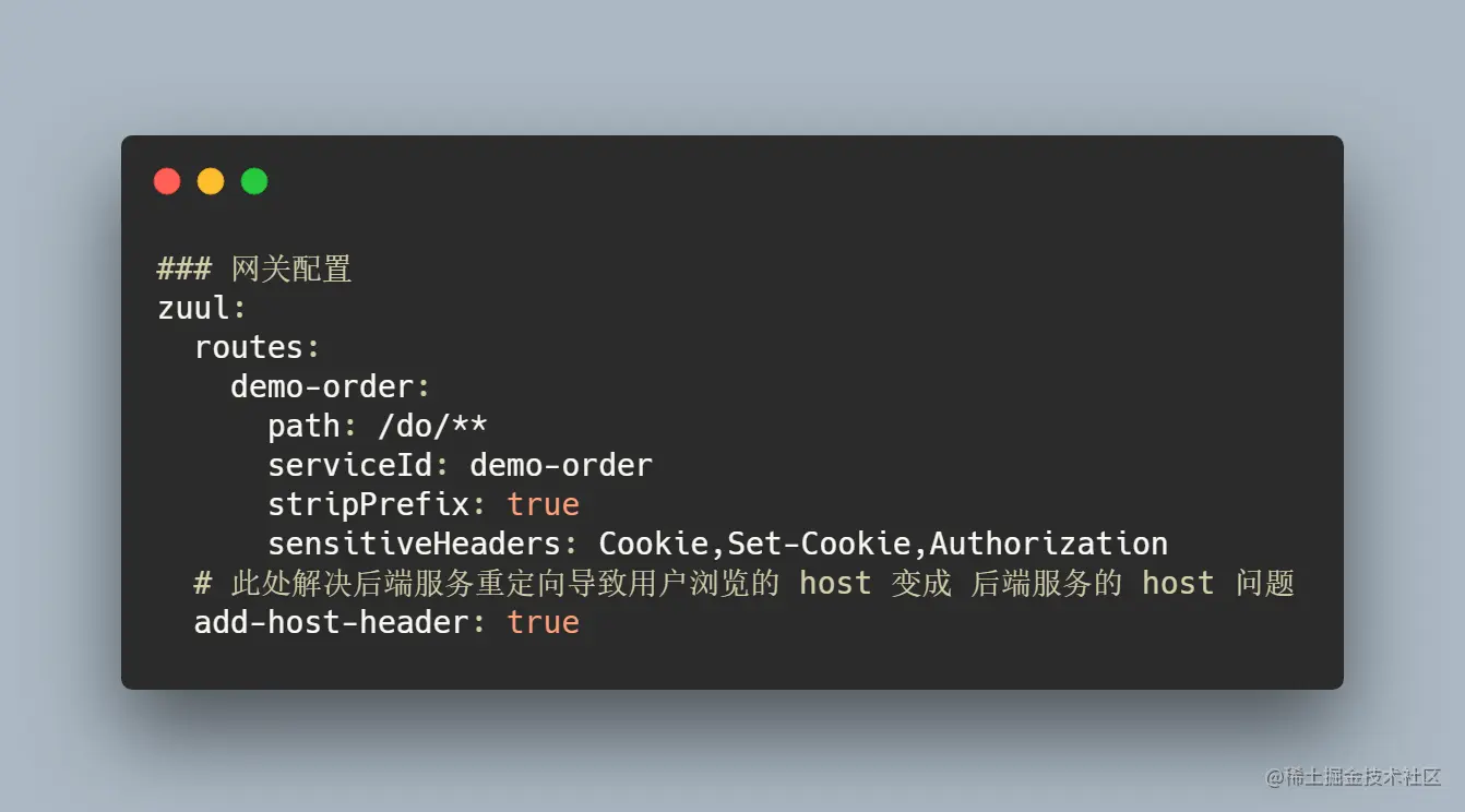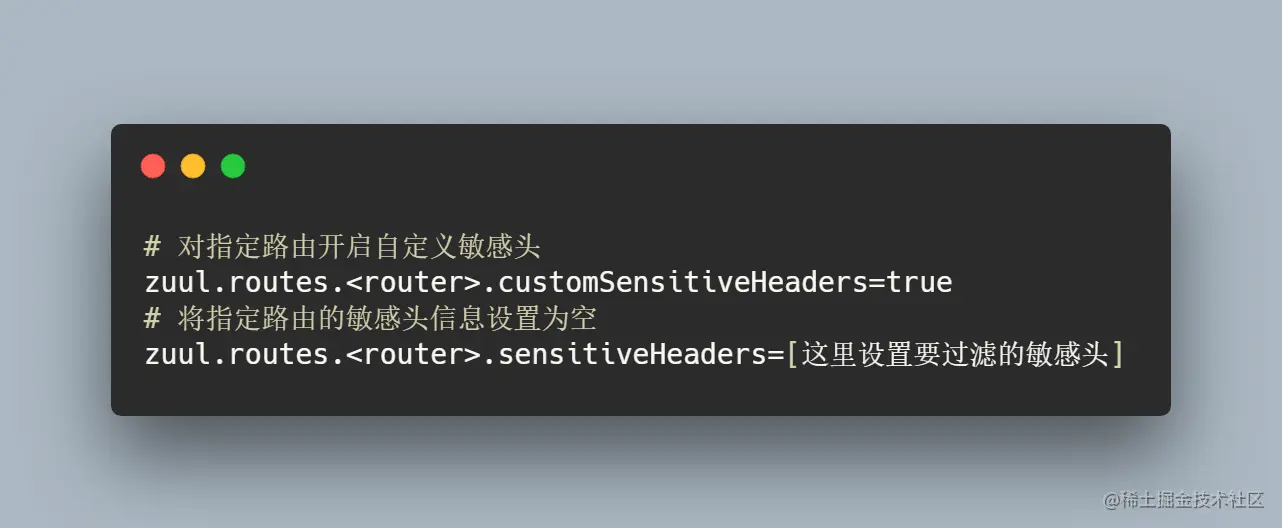 Spring Cloud Zuul 在请求路由时,通过zuul.sensitiveHeaders 参数定义,包括Cookie、Set-Cookie、Authorization 三个属性来过滤掉HTTP请求头信息中的一些敏感信息,防止它们被传递到下游的外部服务器。
