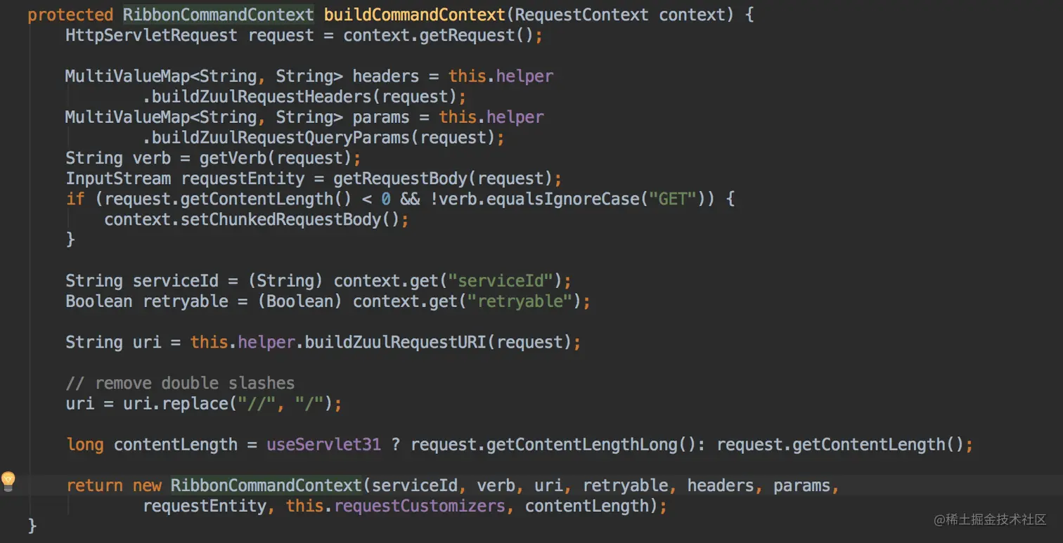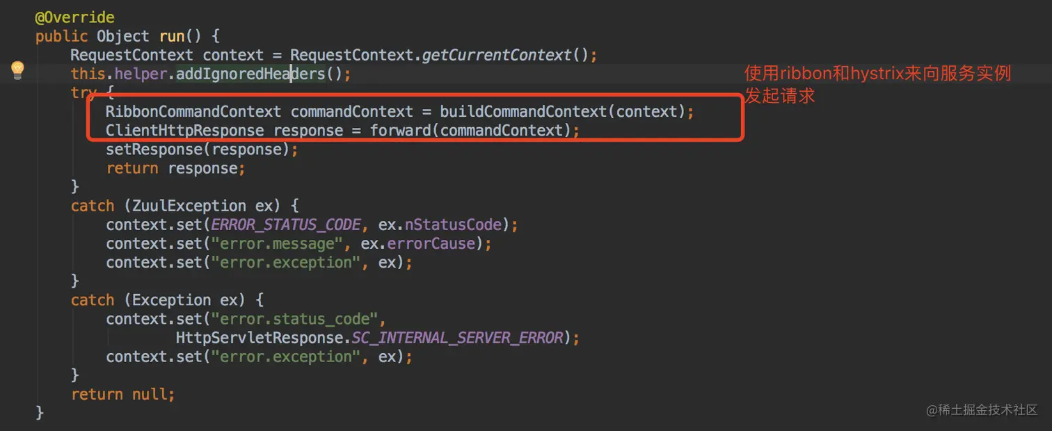 而该过滤器的执行逻辑就是面向服务路由的核心,它通过使用ribbon和hystrix来向服务实例发起请求,并将服务实例的请求结果返回。