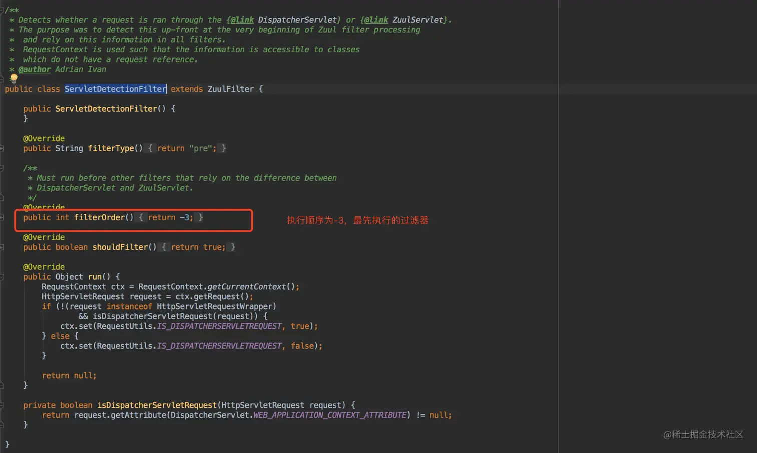 该过滤器总是会被执行,主要用来检测当前请求是通过Spring的DispatcherServlet处理运行的,还是通过ZuulServlet来处理运行的。