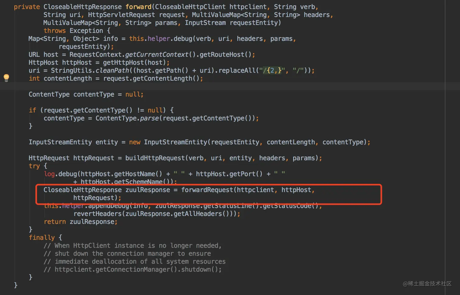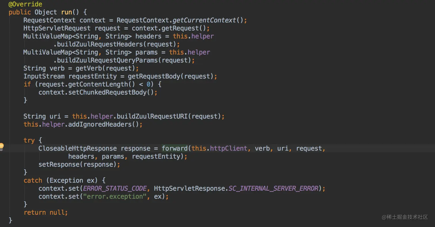 而该过滤器的执行逻辑就是直接向routeHost参数的物理地址发起请求,从源码中我们可以知道该请求是直接通过httpclient包实现的,而没有使用Hystrix命令进行包装,所以这类请求并没有线程隔离和断路器的保护。