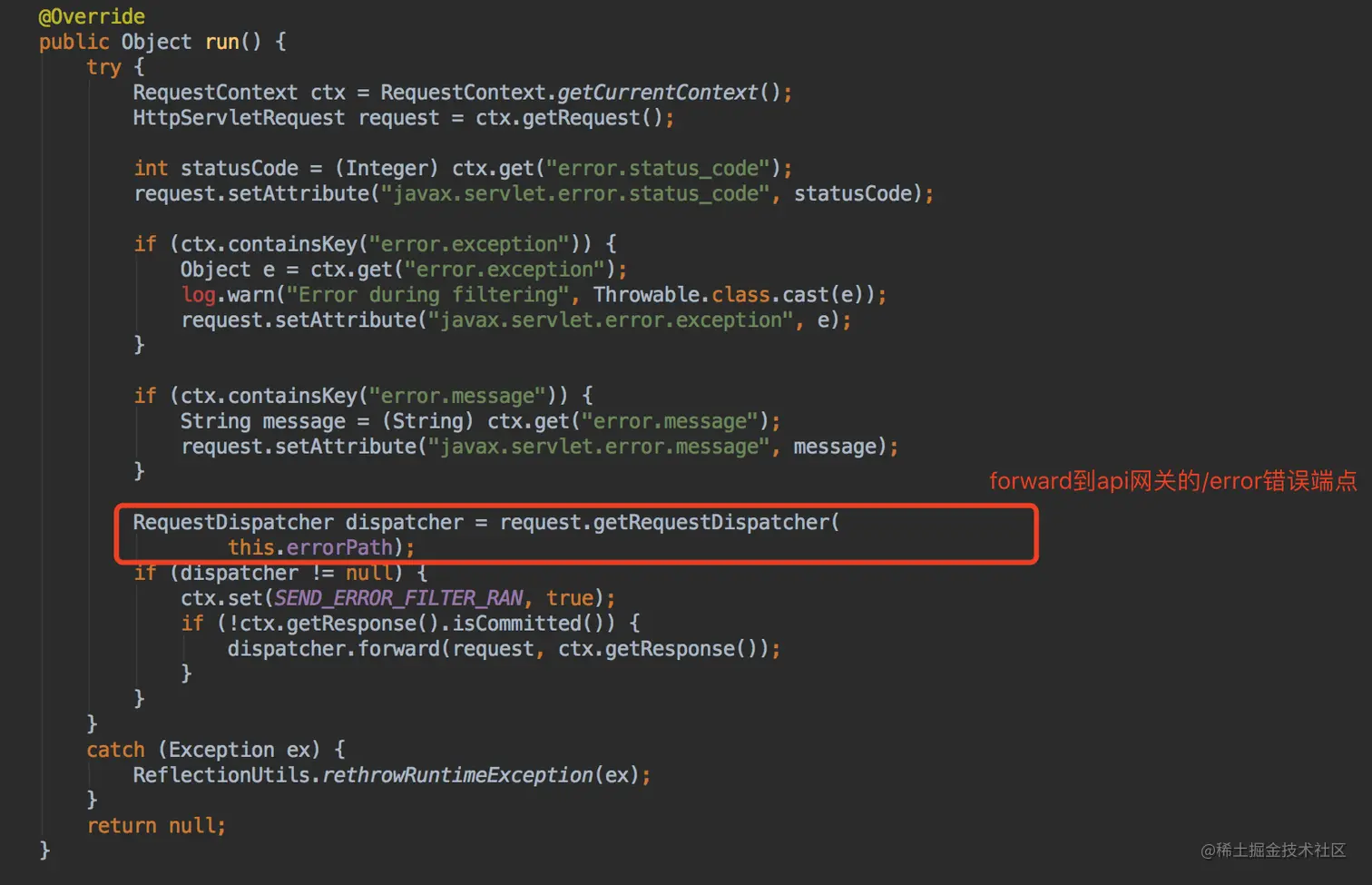 它的执行顺序是0,是post阶段的第一个执行的过滤器。该过滤器仅在请求上下文中包含error.status_code参数(由之前执行的过滤器设置的错误编码)并且还没有被该过滤器处理过的时候执行。而该过滤器的具体逻辑就是利用上下文中的错误信息来组成一个forward到api网关/error错误端点的请求来产生错误响应。
