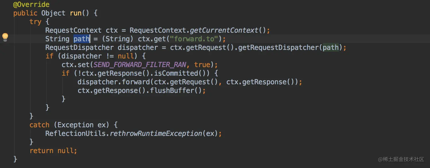 它的执行顺序是500,是route阶段第三个执行的过滤器。该过滤器只对请求上下文中存在的forward.do参数进行处理请求,即用来处理路由规则中的forward本地跳转装配。