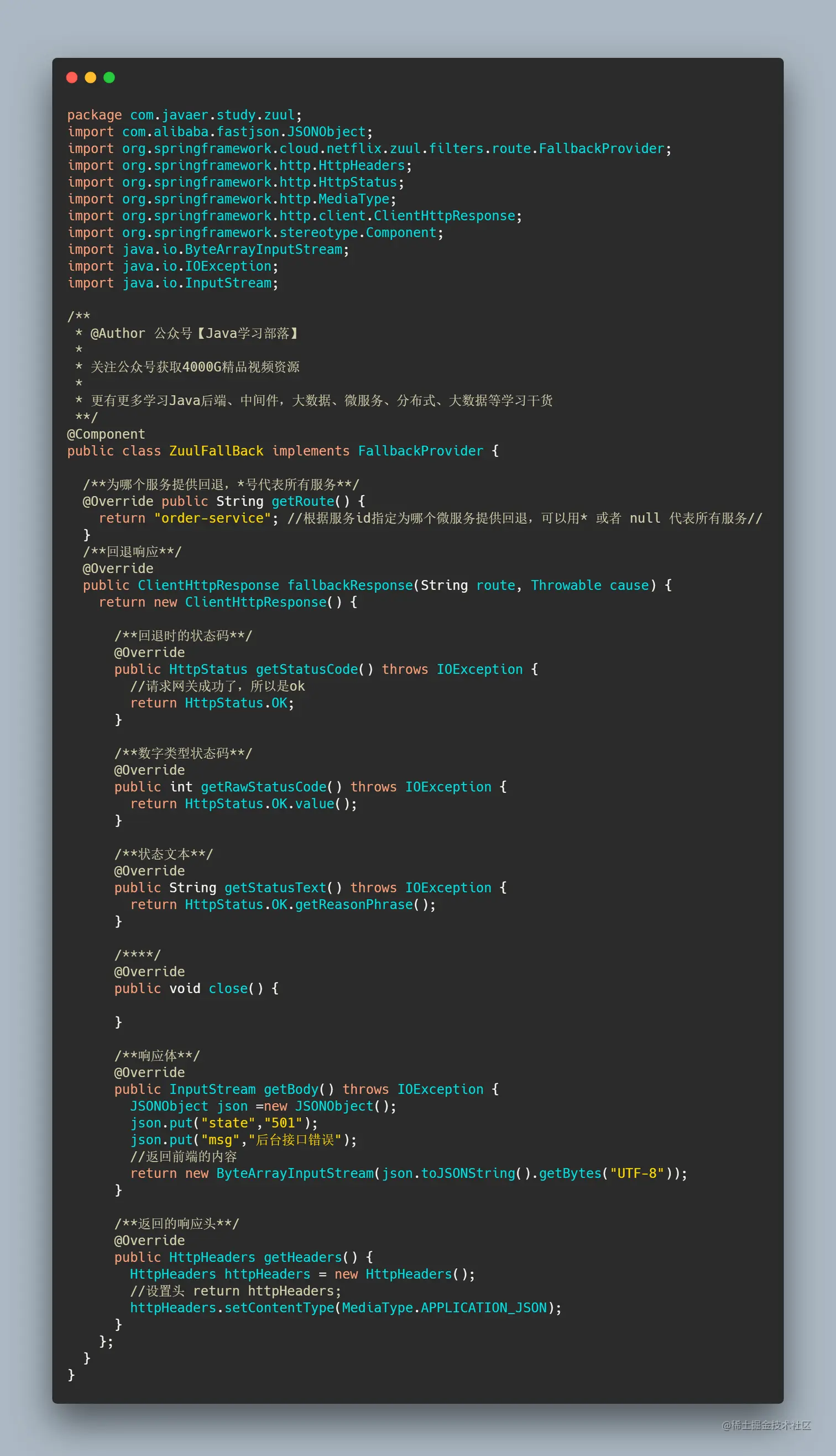 要实现Zuul添加回退,需要实现ZuulFallbackProvider接口,然后在实现类中,指定为哪个微服务提供回退,并提供一个ClientHttpResponse作为回退响应。